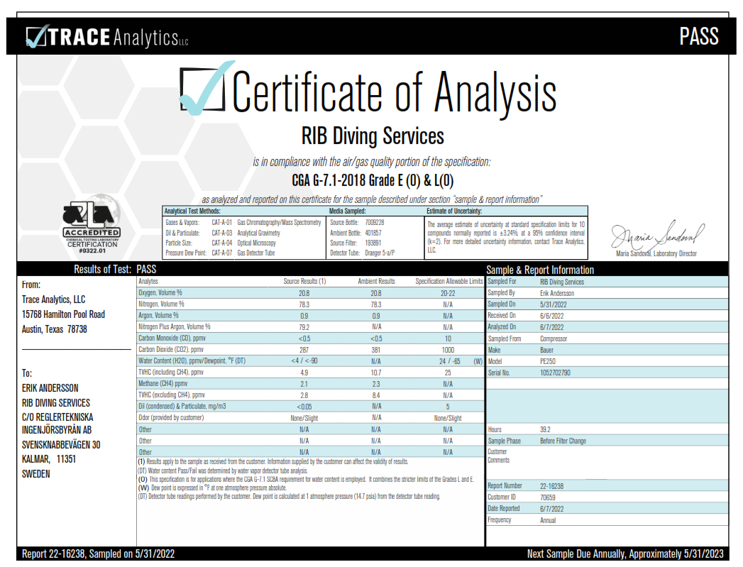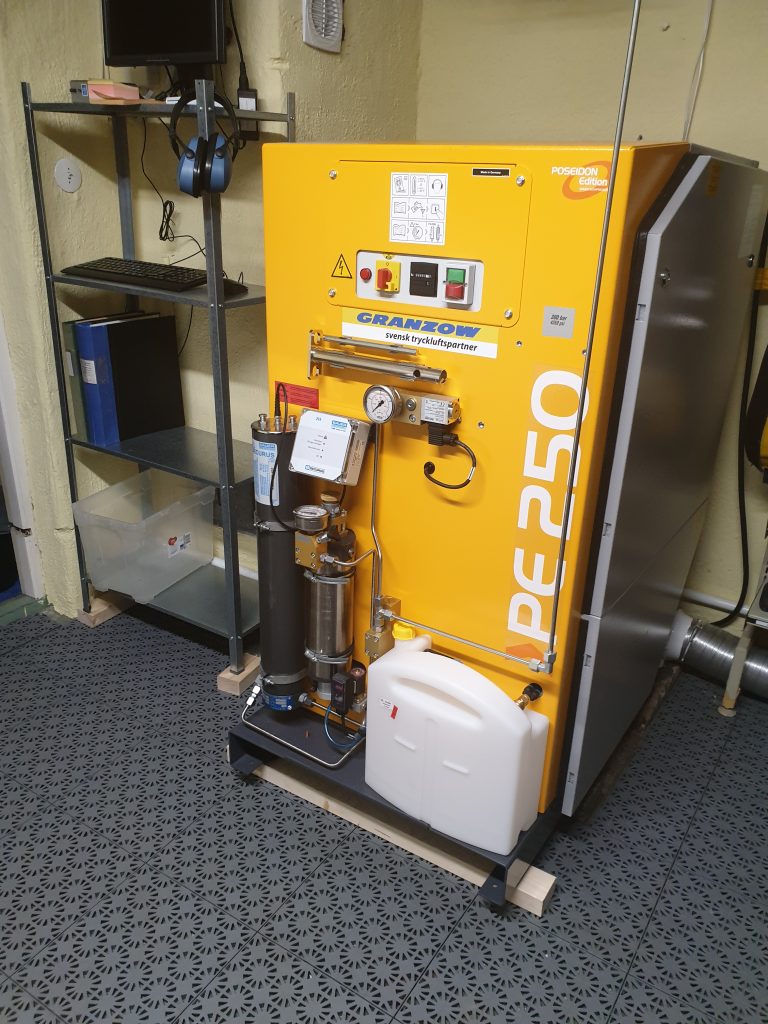 Vi har en helt ny kompressor från Bauer, av modellen PE250. Med den kan vi fylla flaskor till 200 eller 300 bar. Kompressorn har automatisk filterövervakning för bästa luftkvalitet. Naturligtvis underhålls kompressorn enligt tillverkarens instruktioner och luften analyseras enligt rekommenderade intervall.