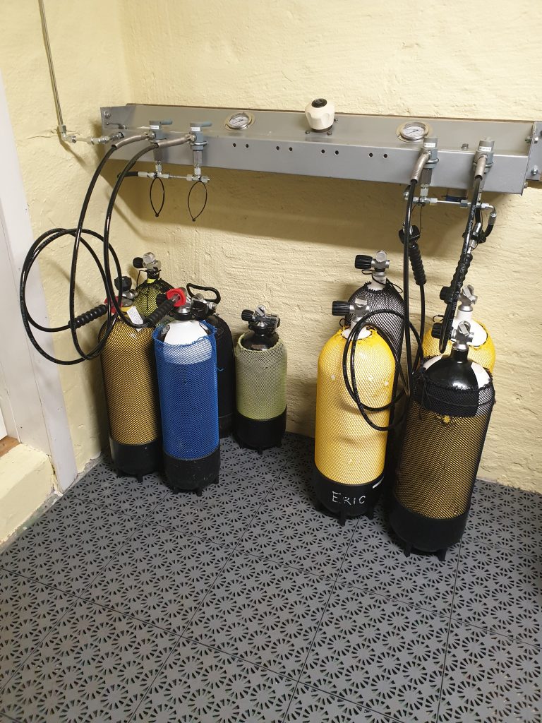 Vi har också två bankflaskor 300 Bar, 80 liter styck. Det innebär att vi kan fylla en flaska på bara ett par minuter.