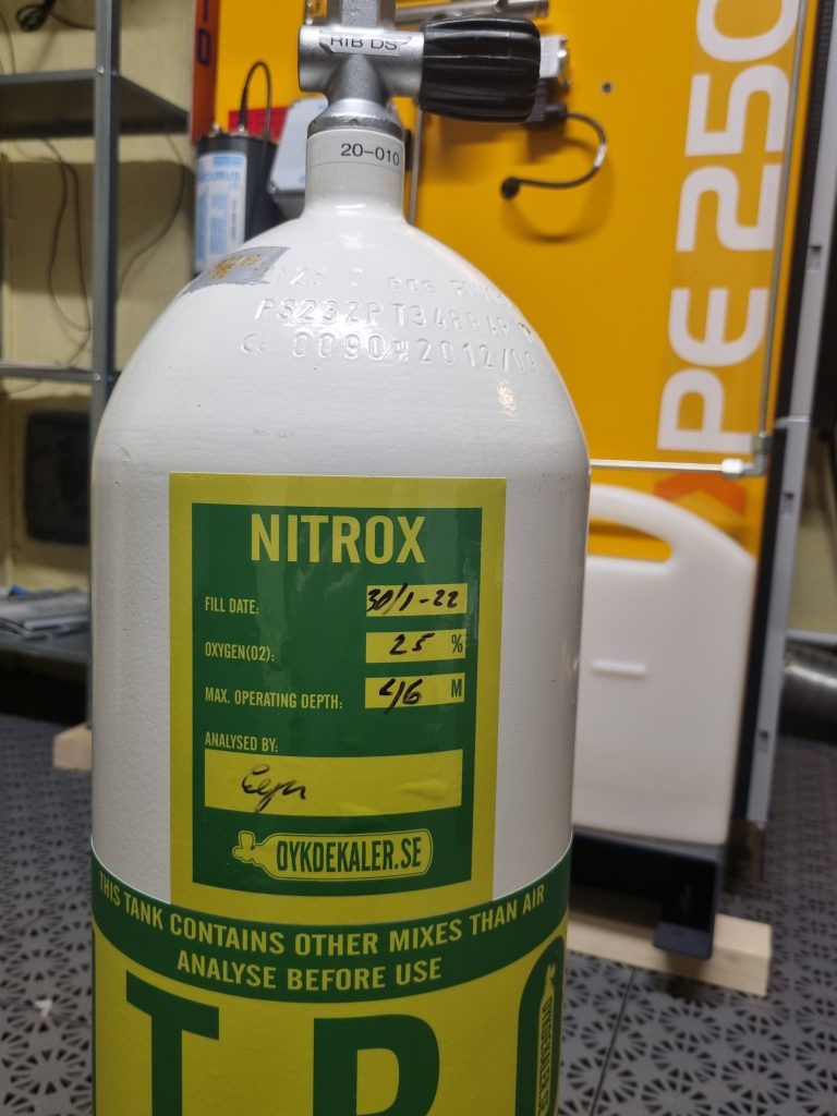 Vi fyller Nitrox enligt In-line metoden med en blandningsstation från LMNT. Det innebär att flaskorna inte behöver vara O2-tvättade. Det enda som krävs är att flaskorna är uppmärkta enligt branchstandard. Om dina flaskor inte är märkta kan du köpa dessa märkningar av oss.